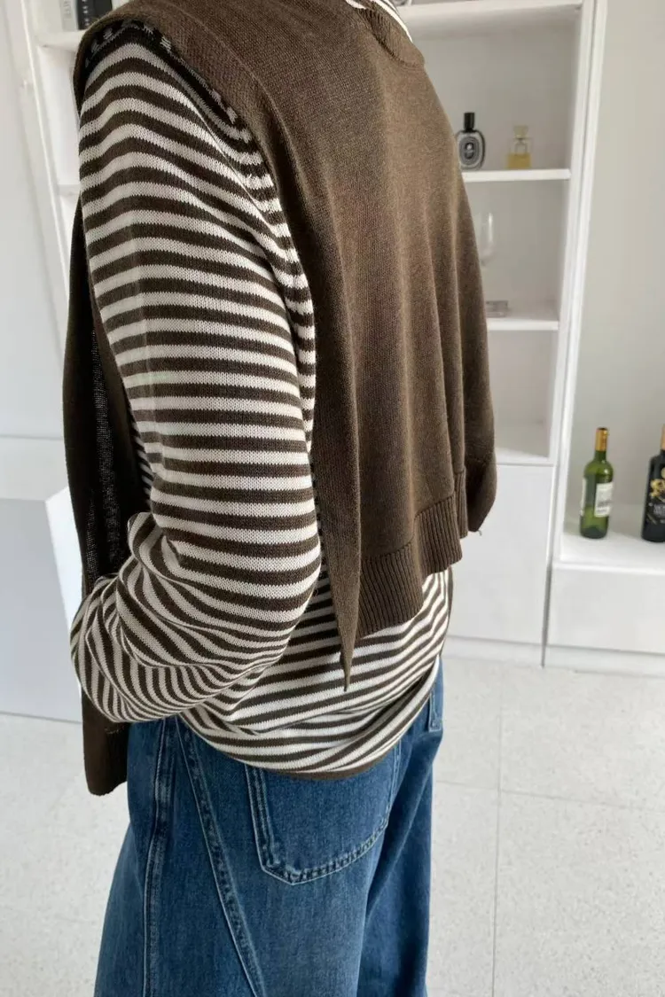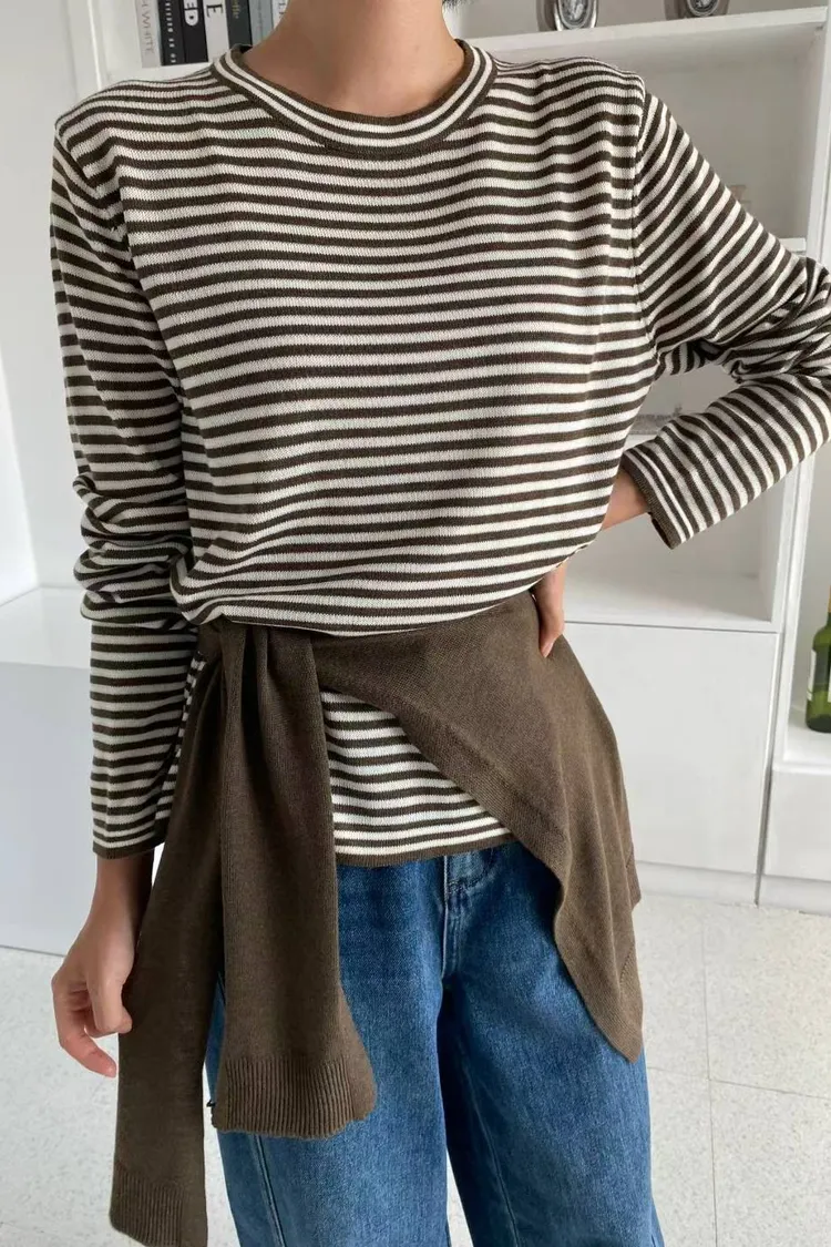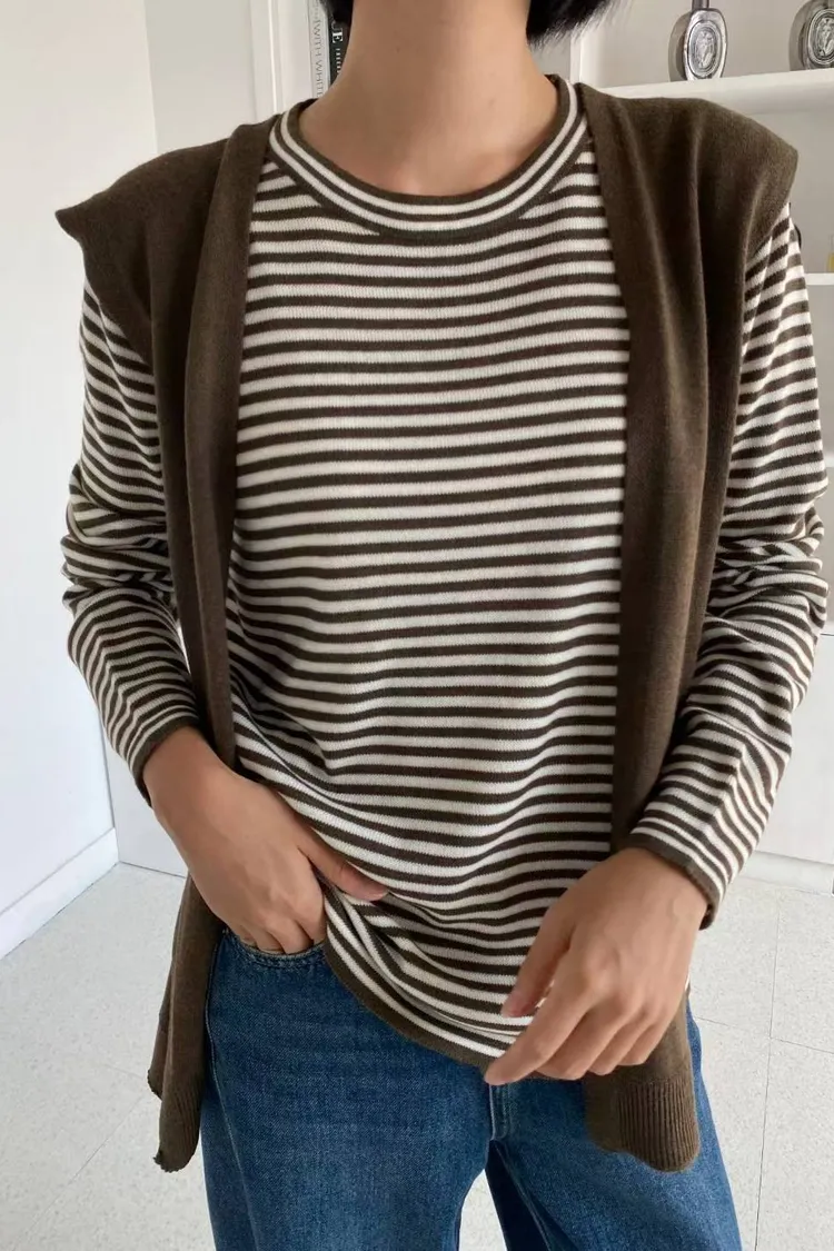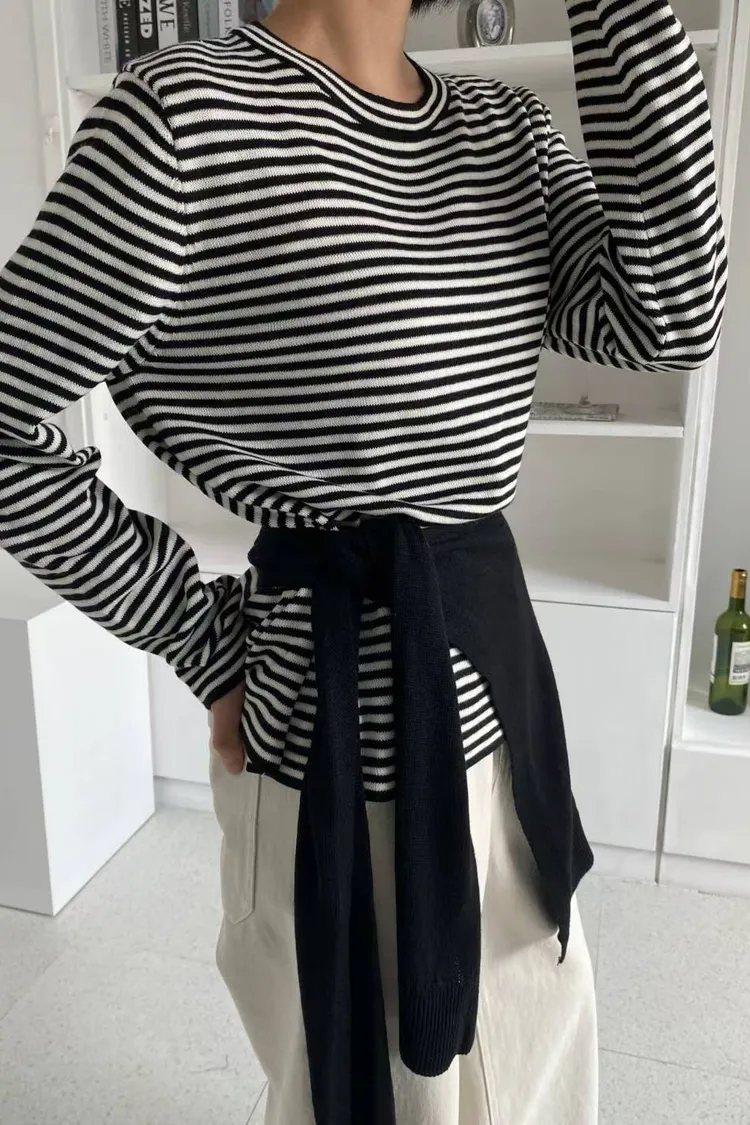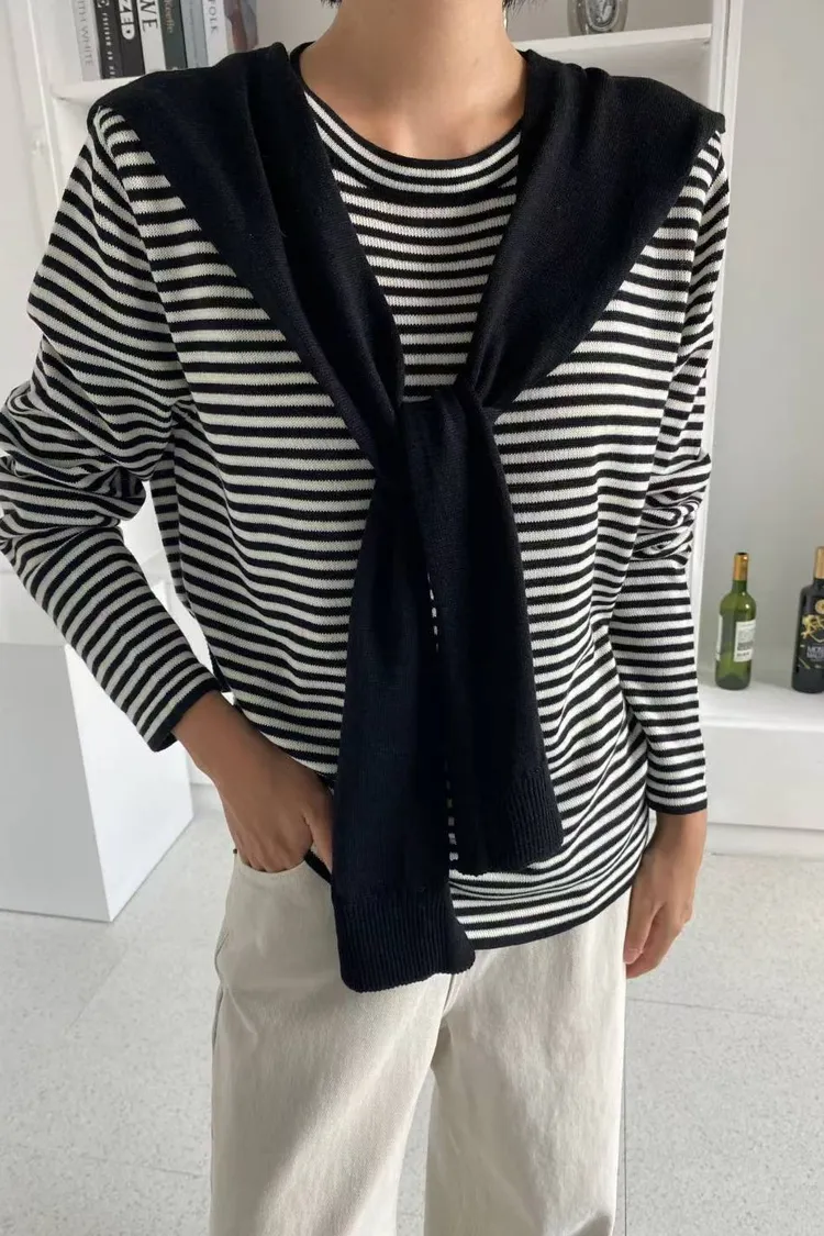 秋色翩翩 細條紋披肩綁帶上衣(2colors)